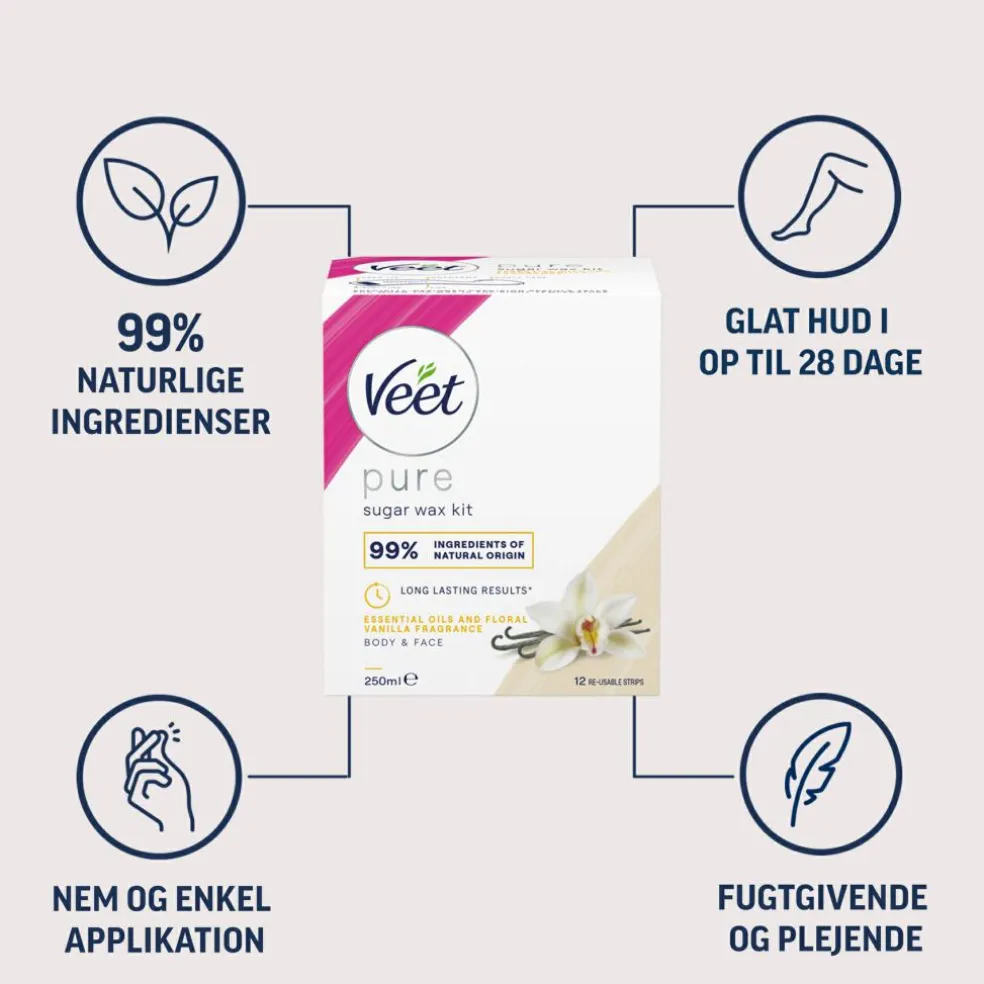 Veet Sugaring er til den rutinerede voks-bruger og til dem, som ønsker et professionelt resultat derhjemme. Veet Sugaring er lavet af 99% naturlige ingredienser og kan derfor vaskes af med varmt vand. Varm krukken op, og spred voksen jævnt for et perfekt resultat. Fjern med de medfølgende genbrugelige stofstrips. Resultatet holder i op til 28 dage.
