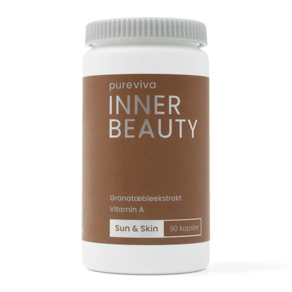 Pureviva Inner Beauty Sun & Skin er et kosttilskud, som består af betacaroten og ellaginsyre fra granatæble.