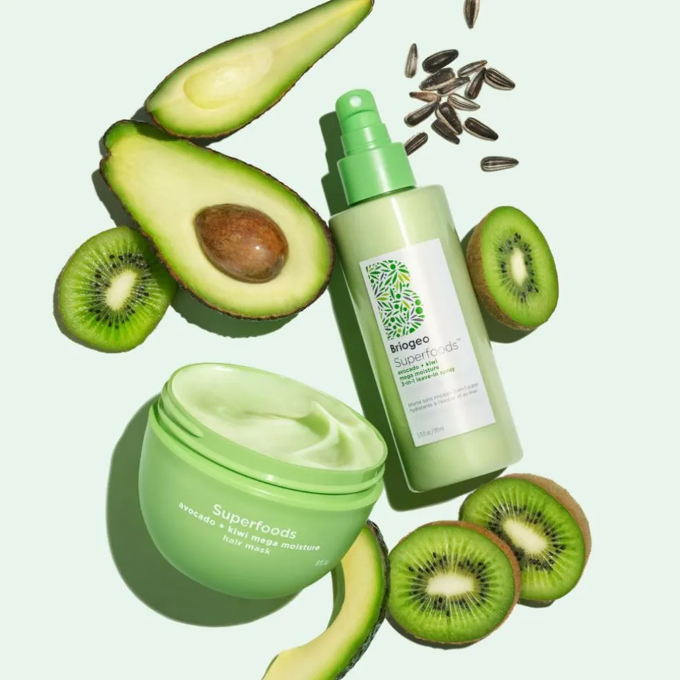 Briogeo Superfoods™ Avocado + Kiwi Mega Moisture 3-in-1 leave-in spray udfiltrer, plejer og beskytter håret mildt mod udtørrende og skadelig påvirkning fra solens UV-stråler. Denne formel er beriget med phytonutrienter som spinat, chiafrø og kakaosmør for intens hydrering og et nærende boost, der forbedrer håndterbarheden, og hjælper med at genoprette fugt og glans for sundt udseende hår.