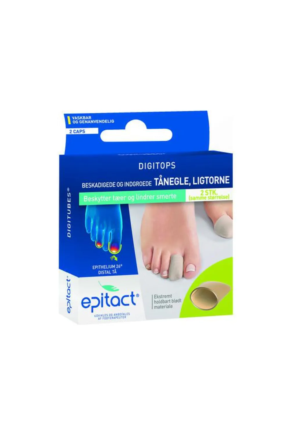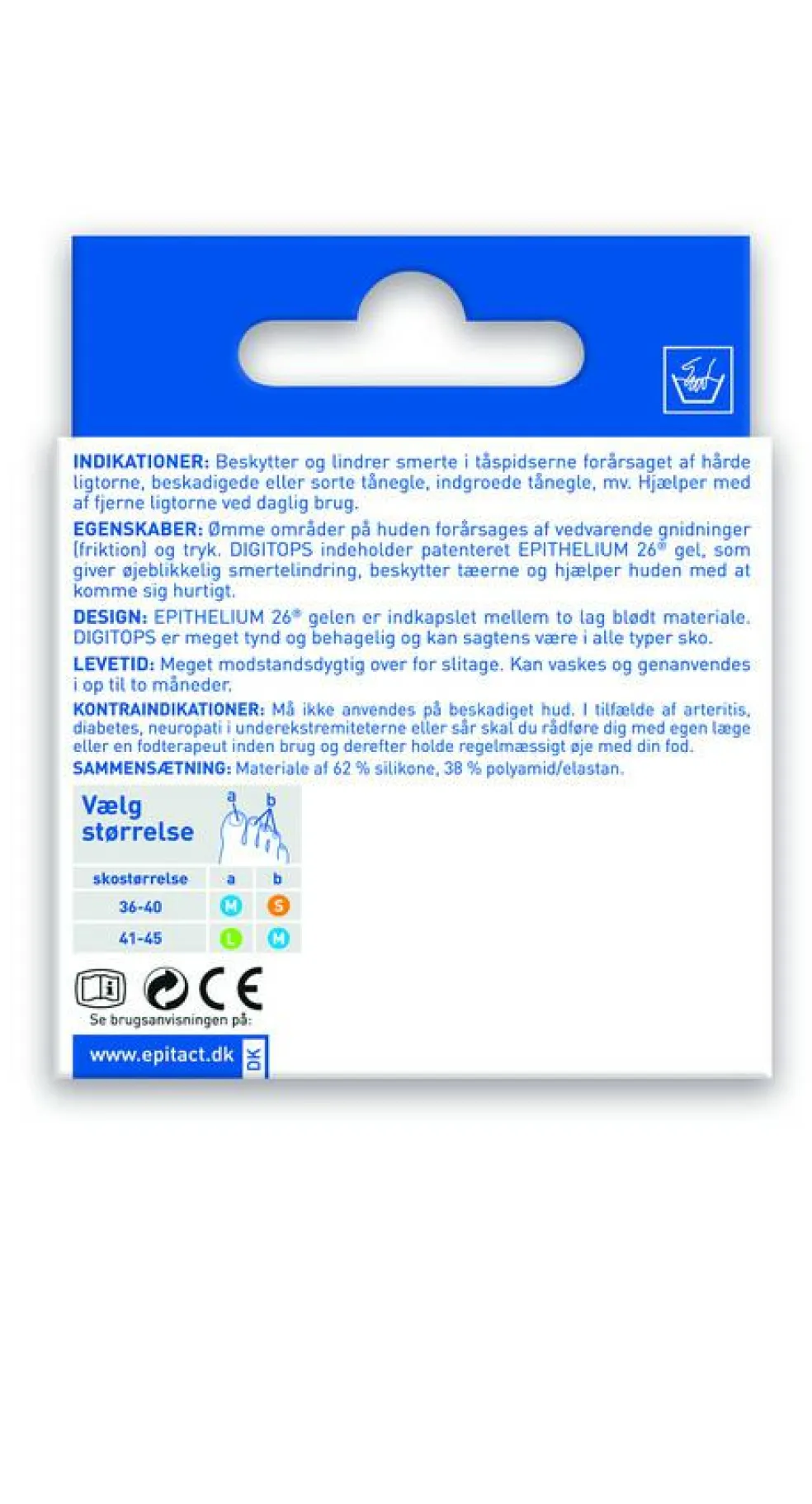 Ømme områder på huden forårsages af vedvarende gnidninger (friktion) og tryk. Tåkappen/digitops indeholder patenteret EPITHELIUM 26® gel, som giver øjeblikkelig smertelindring, beskytter tæerne og hjælper huden med at komme sig hurtigt.