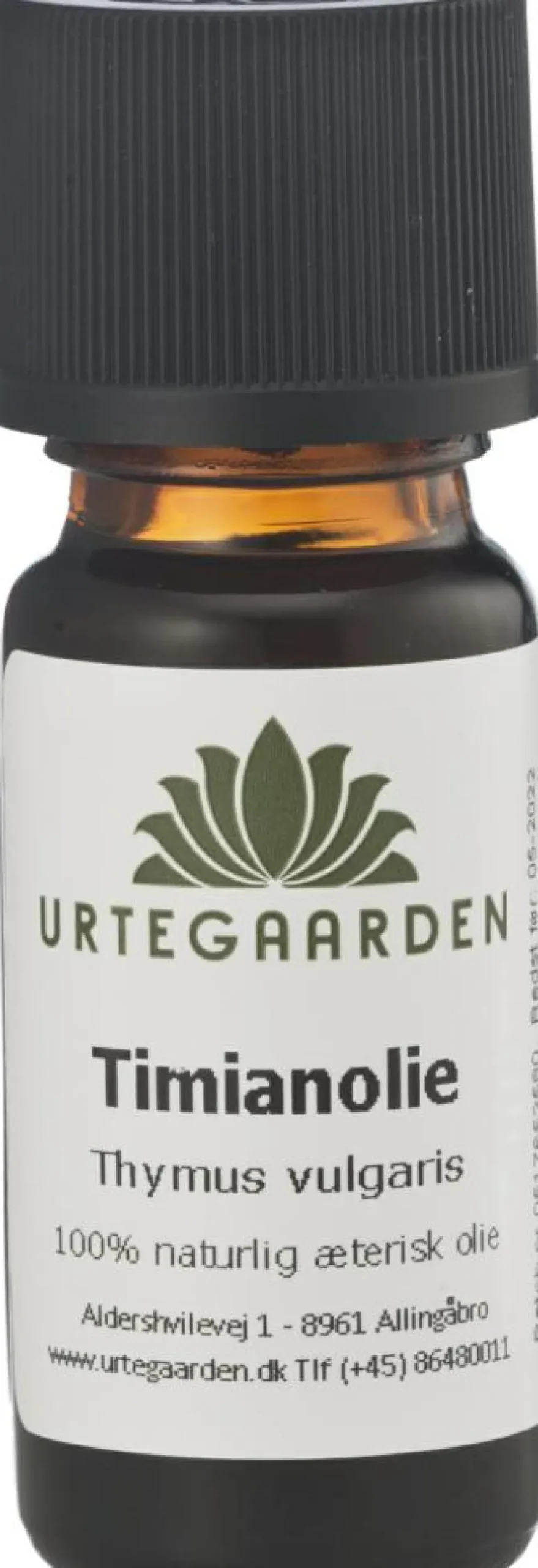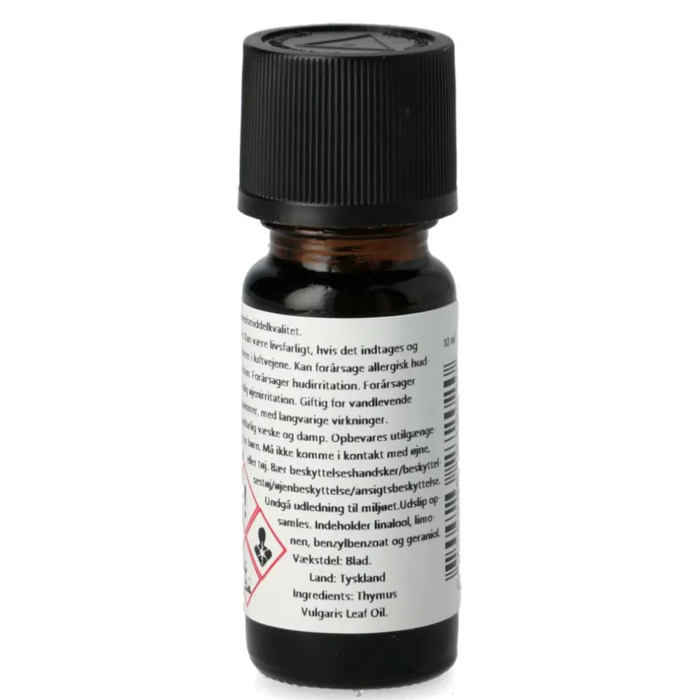 Fremstillet ved vanddampdestillering af blad fra Thymus vulgaris. Kemotype: Thymol.