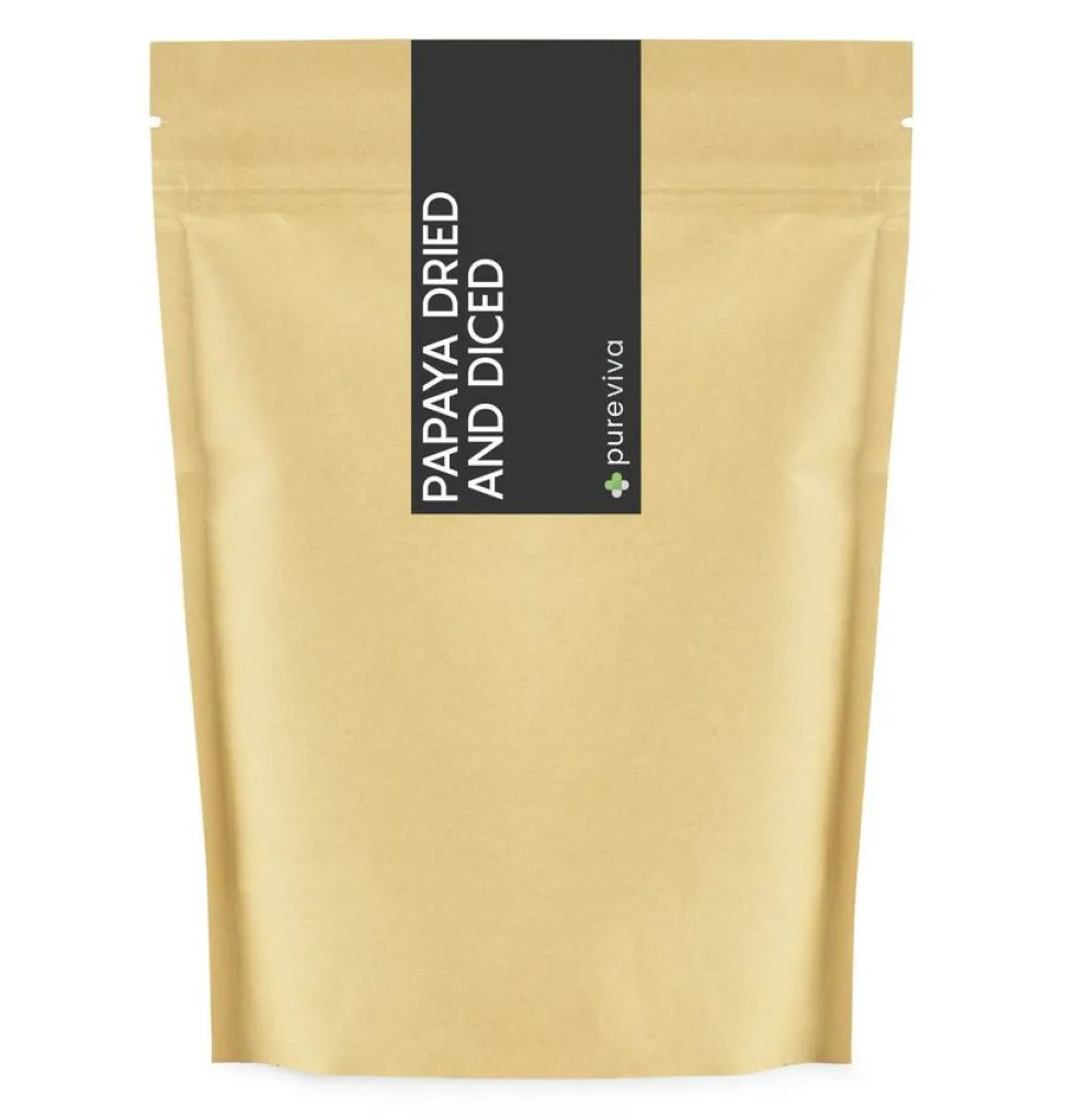 Pureviva Tørret papaya, er en pose med smagfulde, økologiske tørret papaya stykker. Smagen er sød og eksotisk, og er den perfekte snack til dig med en sød tand. Kan med fordel også anvendes i salater.