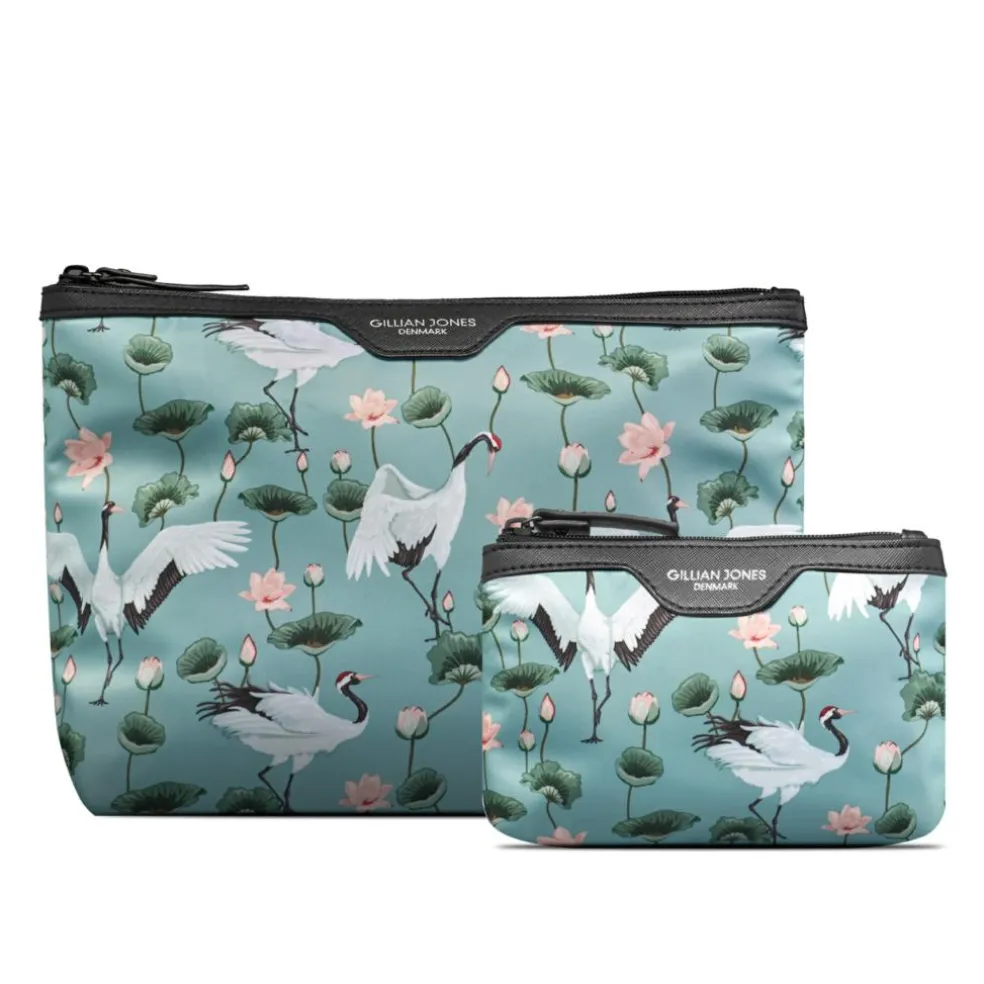Sæt med toilettaske og makeup pung, fra Urban Travel linjen der er designet og produceret med så lidt co2 aftryk som muligt. Både toilettasken og makeup pungen udvider sig efter hvor meget du putter i, designet er stramt og leveres uden unødvendig udstopning. Materialet af genanvendt nylon med en fast kant i PU der gør at kosmetik tasken holder faconen. Kan maskinvaskes ved 30 g.Inden i toilettasken er der en lynlås lomme samt 2 net lommer. Der er mange anvendelse måder; Hold styr på din mobiltelefon incl headset, opbevar dine solbriller sammen med kreditkort, og selvfølgelig til din uundværlige make up og pleje midler. Kan maskinvaskes ved 30 grader, og lave omdrejninger, og tørres ved lav varme. Alle toilettaske-sæt fra Gillian Jones Urban linjen fås i mange forskellige farver og prints.
