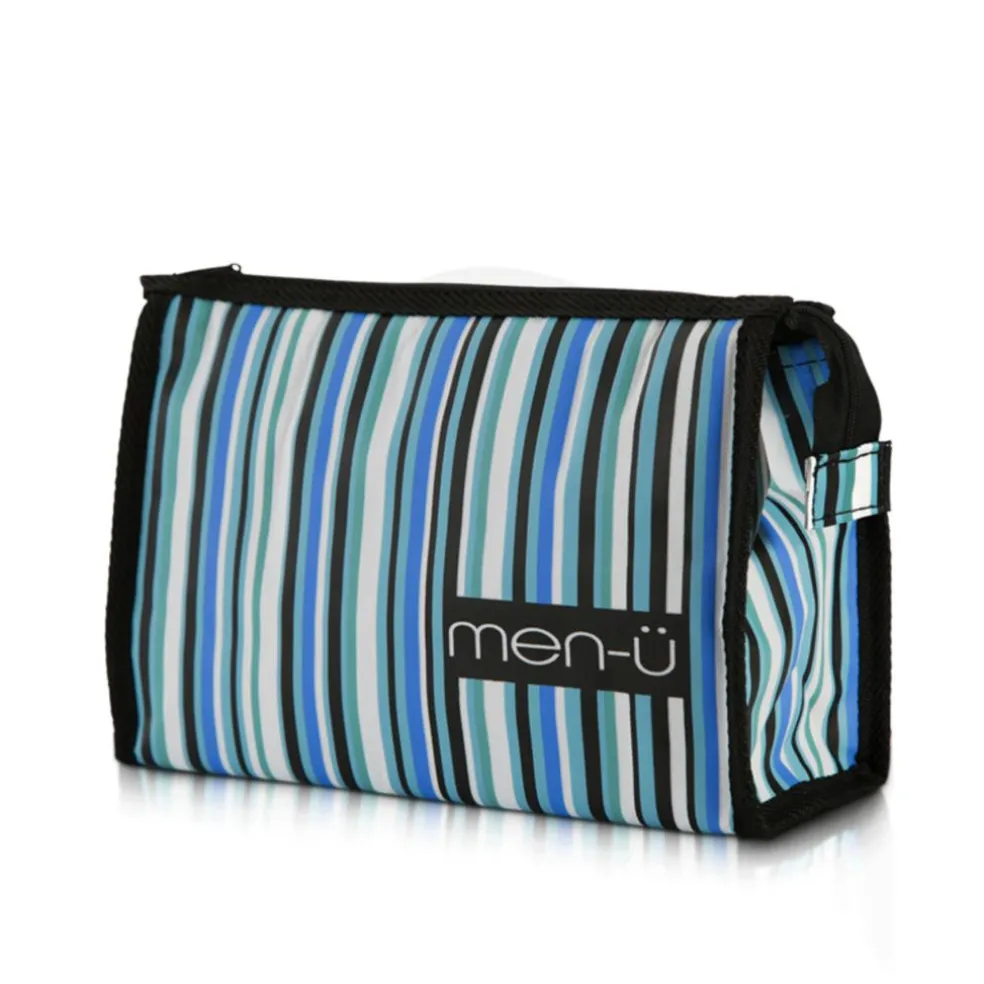 Har en robust lynlåslukning med fingerløkke og strop for nem transport. Stænktæt lærredsmateriale udvendig og vandafvisende materiale indvendig med et separat indvendigt rum til eksempelvis din skraber eller tandbørste. Lavet i et moderne og stilfuldt sort, hvidt, grønt og blåt stribet design med sort kant.