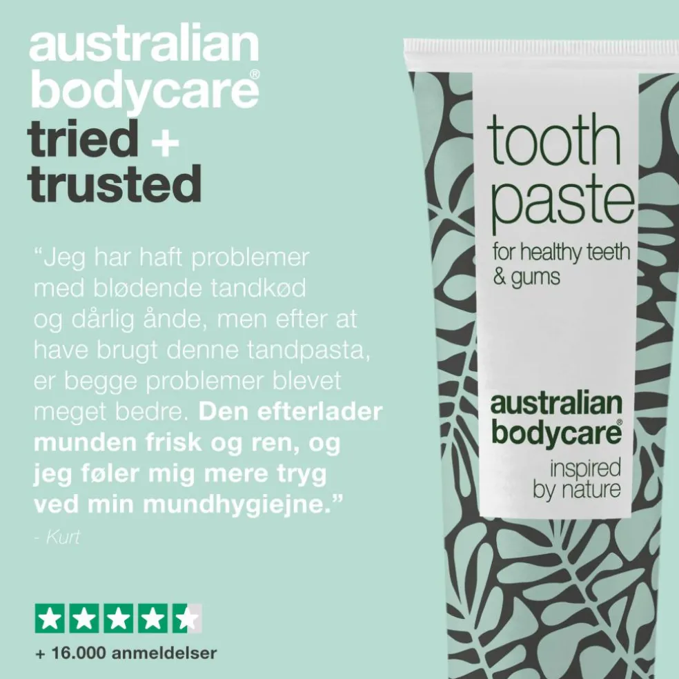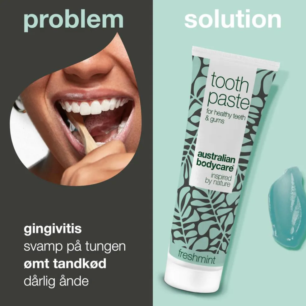 Tandpasta med Tea Tree Oil plejer og minimerer tandkødsproblemer og kan bruges ved ømt tandkød, dårlig smag i munden, røde og irriterede gummer og dårlig ånde.