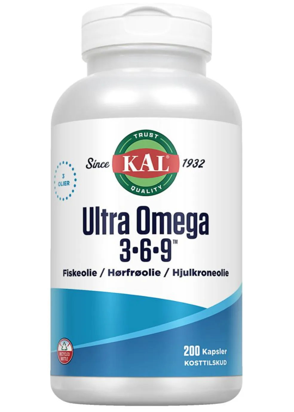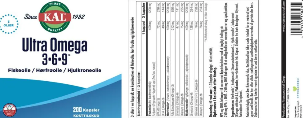 Ultra Omega 3-6-9 indeholder en kombination af fiskeolie og planteolier fra Hjulkrone og Hørfrø, der indeholder Omega-3 fra fiskeolie såvel som Omega-6 og -9.