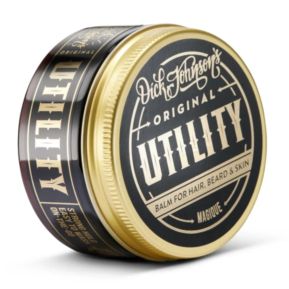 Dick Johnson’s Utility Balm er velegnet til styling af hår, skæg og overskæg samt som hudcreme, tro det eller ej. Det, der adskiller Dick Johnson’s Pomade fra de andre, er, at det er lykkedes os at lave en oliebaseret pomade uden vaseline. Vi erstattede det med candelillavoks, som er en naturlig plantebaseret voks. Sammen med vores kemikere har vi brugt det meste af to år på at udvikle et naturligt hårfedt, der har et ordentligt hold og nemt kan restyles. Vores Utility Balm er ekstremt hudvenlig, den er ikke klistret og den er nem at vaske. Vi sprøjtede en dejlig mængde Dick Johnson signaturduft kaldet “”Whisky & Vanilla”” i, så med produktet får du den ægte Dick Johnson-oplevelse! Fordi der ikke er brugt vaselin i produktet, tilstopper det ikke porerne. For at sige det enkelt: du får ikke bumser, og din hovedbund bliver godt! Sådan bruges: Spred en mængde produkt på størrelse med en kno jævnt på begge håndflader og spred gennem hår, skæg eller overskæg. – Til hår, skæg og hud – Meget stærkt greb og omformaterbart – Vaskes nemt af – Naturlig, vegansk og vaselinefri