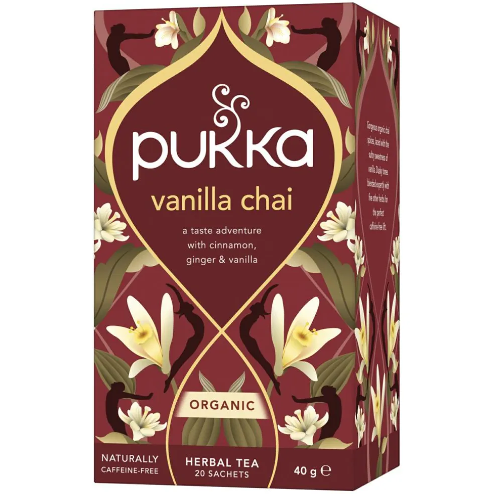 Pukka Vanilla Chai er en krydret økologisk chai te som består af 6 krydderier økologiske og Fairtrade krydderier som hentes fra små selvstændige landbrug verden over.