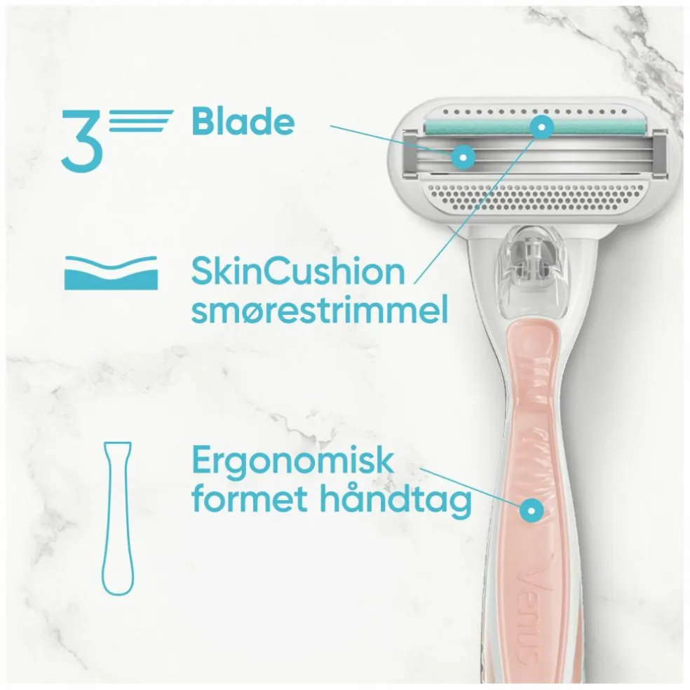 Vores SkinCushion-smørestrimmel (og SkinElixir med et strejf af aloe) hjælper med at beskytte din hud mod irritation. Og hvis du mangler flere måder at give din hud den kærlighed, den fortjener, se hele udvalget af Venus-produkter, fra barberskrabere til barbergeler, engangsskrabere til ansigtsskrabere og meget mere.