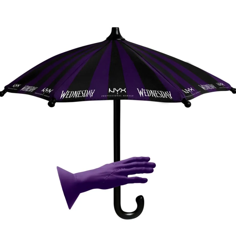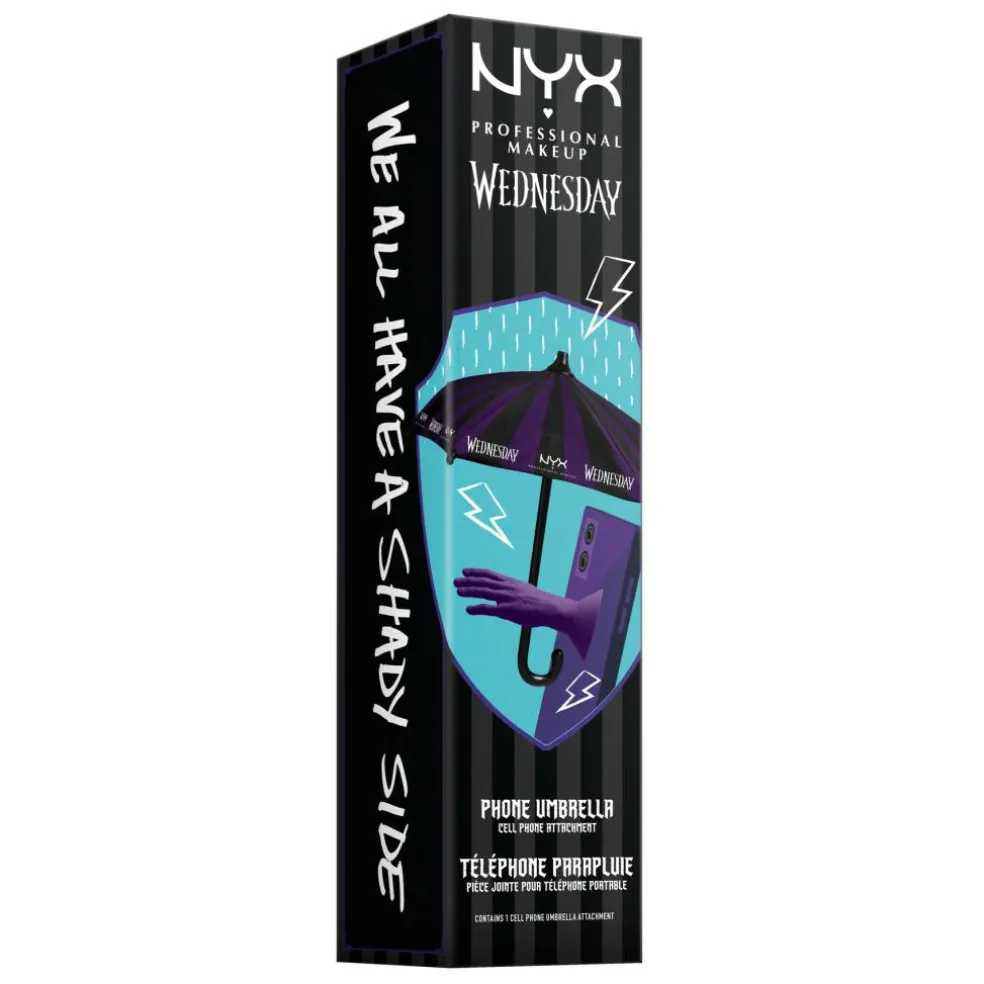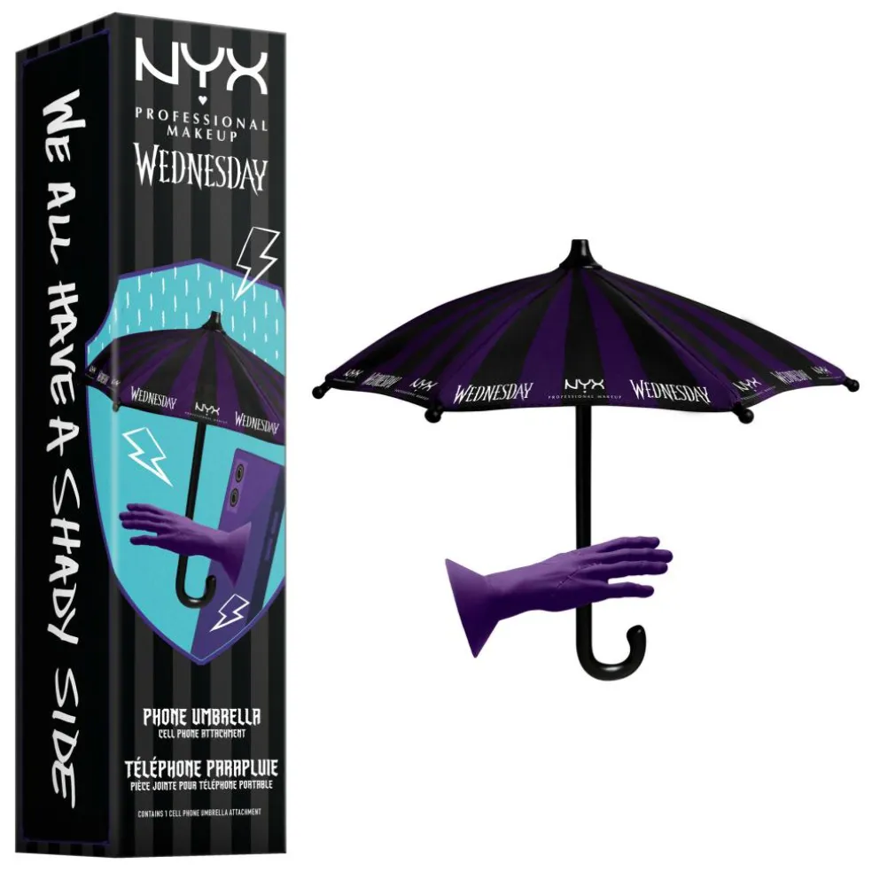Mobilpynt inspireret af Wednesdays ikoniske, lilla paraply – et praktisk tilbehør med kant. Endelig findes der en måde at tilføje lidt melankolsk glamour til dit udstyr og samtidig beskytte din skærm fra den hårde virkelighed: solskin, regn eller dårligt lys.
