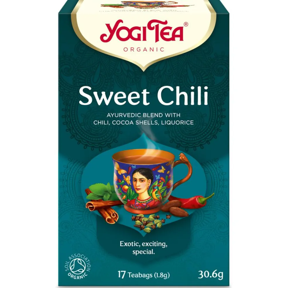Traditionel Yogi Tea urter og krydderier blandes med et gran chili, og kakaonødder bibringer essensen og aromaen fra chokolade.