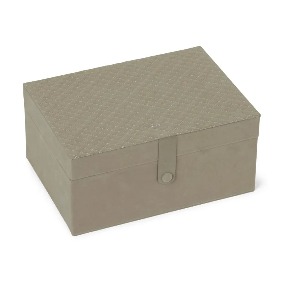 Det er designet i velour og har DAY ET logoet fortil i sølv. Smykkeskrinet kommer i en firkantet form og det lukkes med en knap. Indeni har den et spejl og flere rum, så du nemt kan holde alle dine smykker organiserede.