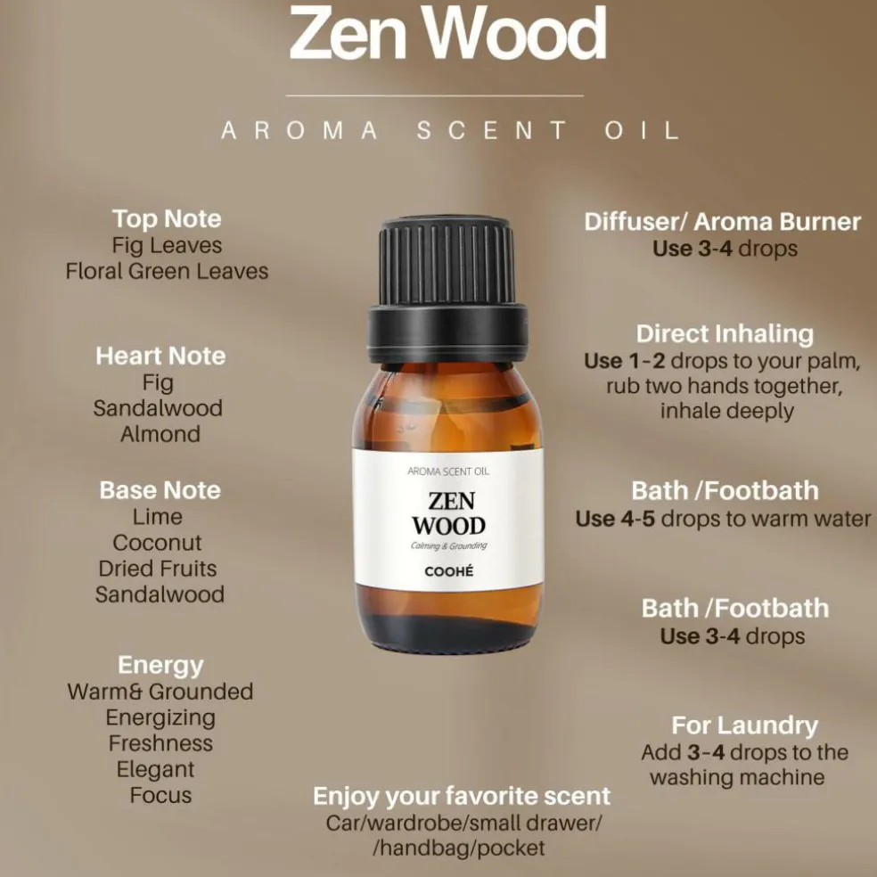 Bløde nuancer af mandel og kokos runder aromaen af og giver en harmonisk, beroligende og opløftende duft, perfekt til både mænd og kvinder. Zen Wood fylder hjemmet med balance, velvære og en følelse af indre ro.