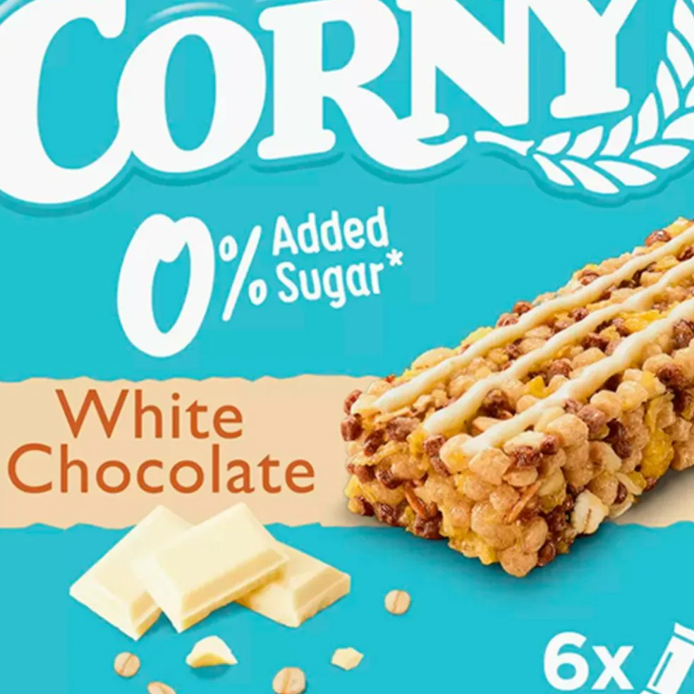 Corny 0% Added Sugar multipack med hvid chokolade indeholder 6 lækre müslibars helt uden tilsat sukker – med samme gode Corny smag som altid.