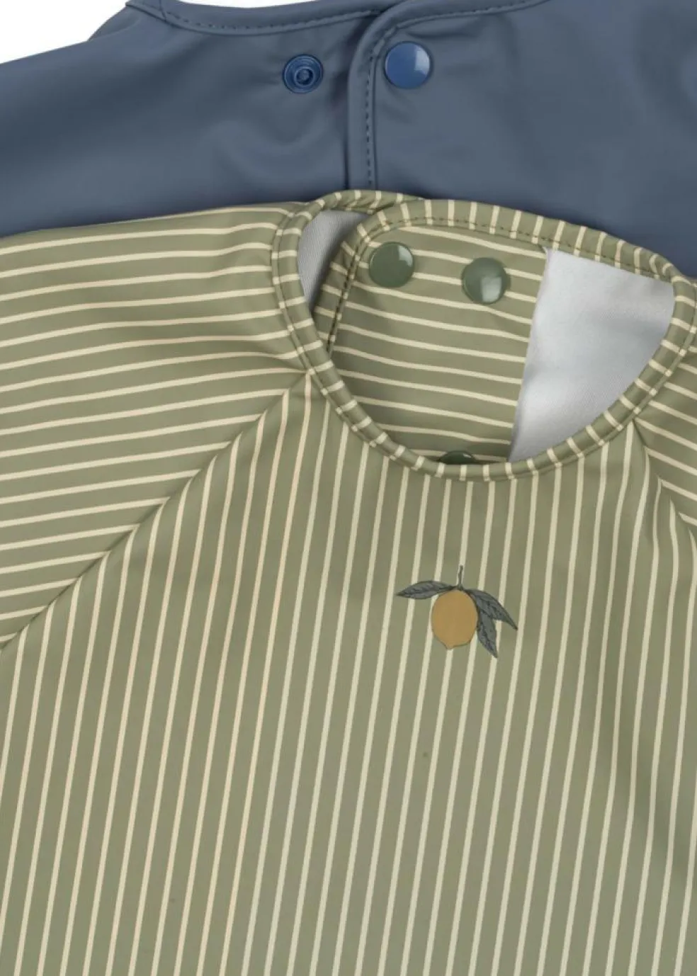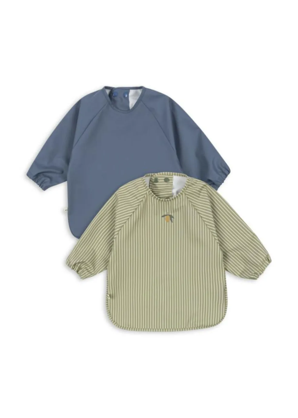 Søde og praktiske hagesmække, der er nemme at rengøre. Hagesmækken har ærmer, så barnets tøj er godt beskyttet. Dette produkt er certificeret i henhold til OEKO-TEX® STANDARD 100, klasse 1 af DTI Tekstil, DTI 2276-361.