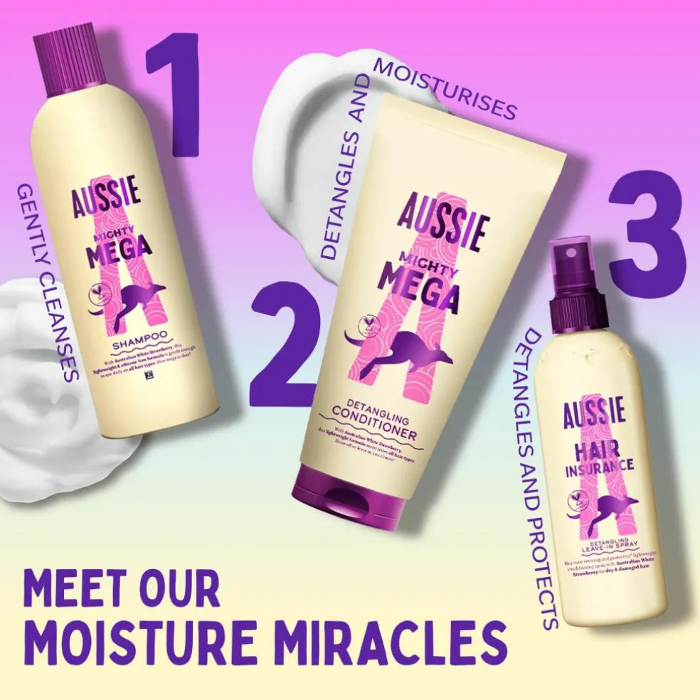 For ekstra pleje, brug den sammen med andre produkter i Aussie Mighty Mega-hårplejeserien. *Vegansk formel: ingen ingredienser eller biprodukter af animalsk oprindelse.