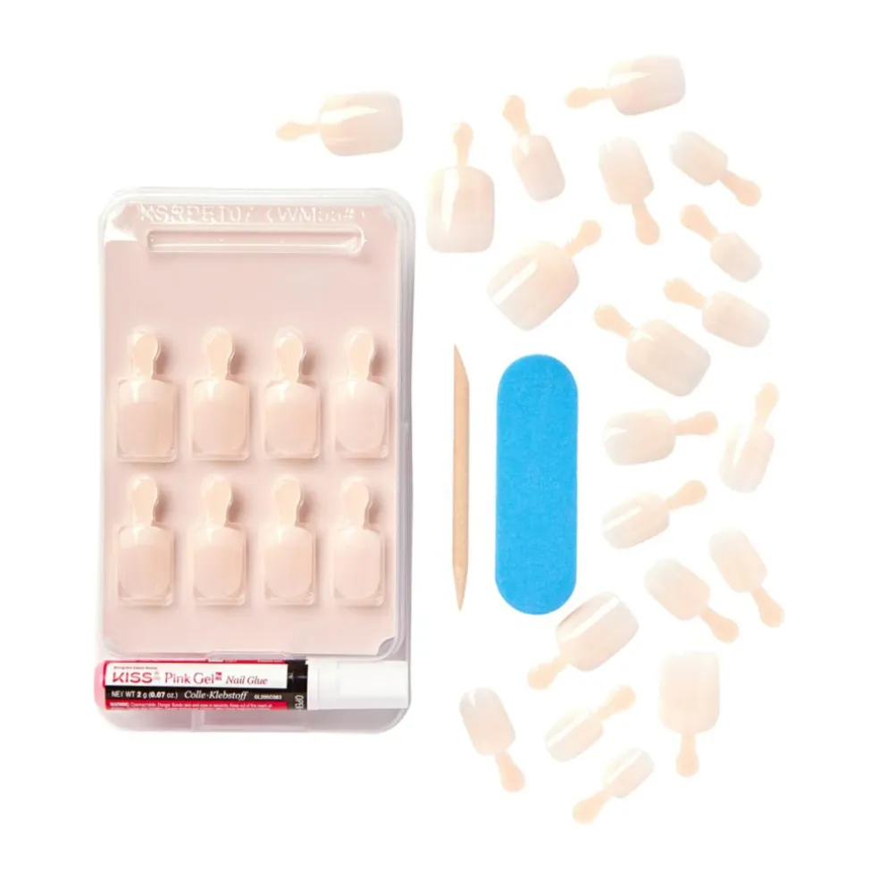 Kiss Salon Acrylic Nude Frecnsh Nails er nogle unikke kunstige negle. Der er indtil flere patenter på disse negle, bl.a. kan den franakse manicurtid ikke flække. Det unikke design sørger for at neglen har en behagelig pasform og den kunstige negl er tyndere nede ved neglebåndet, for et mere naturlig look. Du får et flot resultat på få minutter,