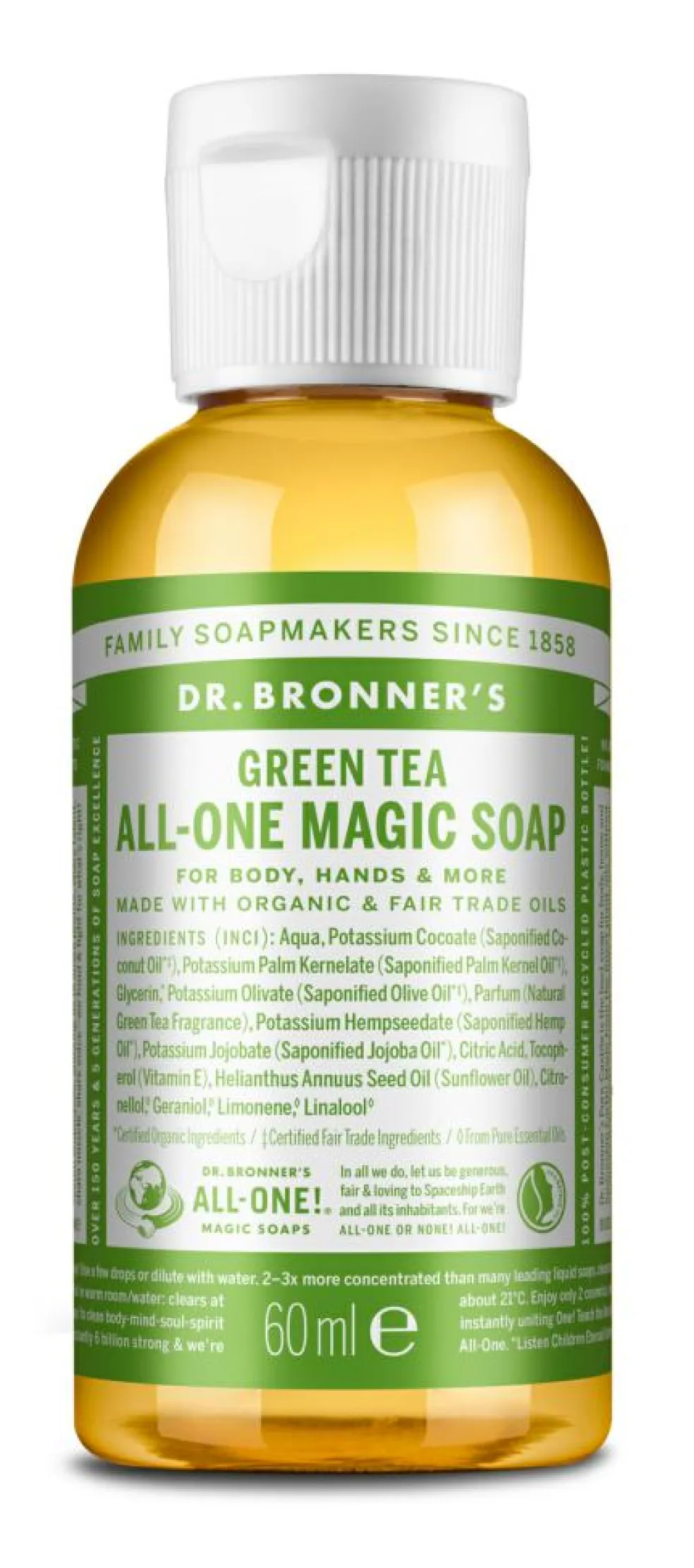 Dr. Bronner’s er en familievirksomhed, der har produceret sæber i generationer. Mærket er kendt for sine funktionelle produkter og sit miljøengagement. Sæben er bionedbrydelig og pakket i 100% genanvendt plastmateriale, der kan genanvendes.