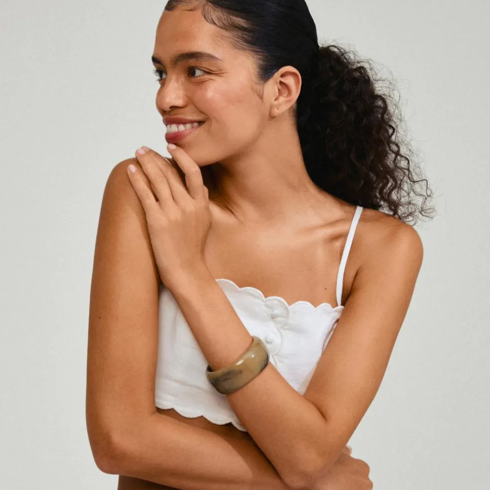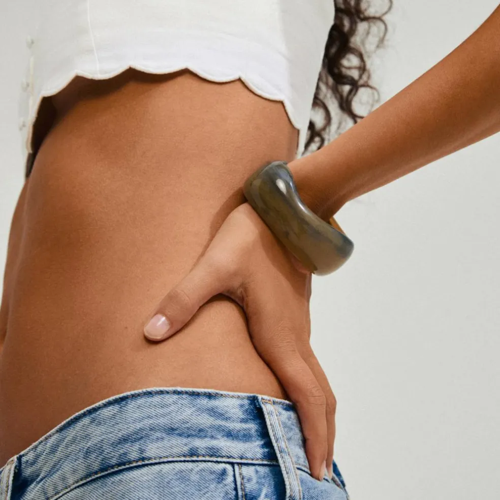 Et chunky bangle i støvet grøn med marmoreringer giver dig en trendy, earthy vibe, der let kan mixes med flere armbånd for en perfekt stacked style.