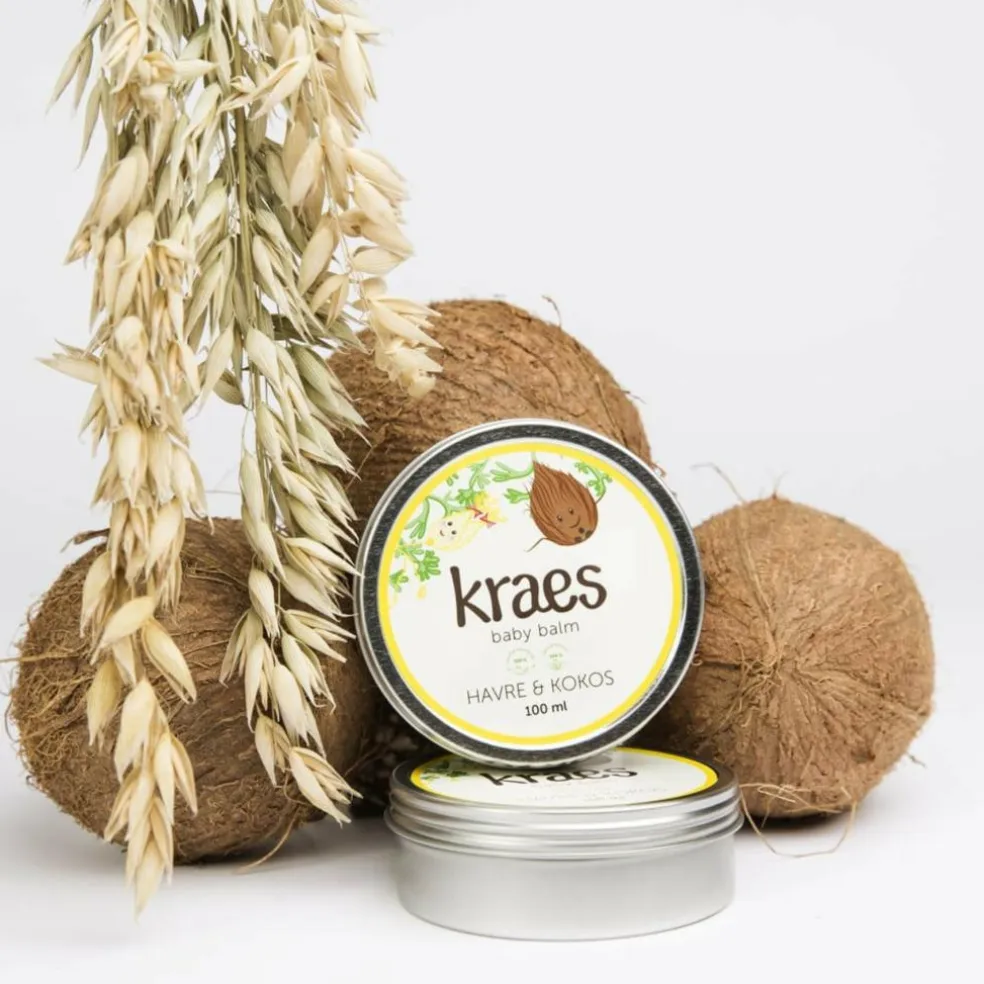 I udviklingen af KRAES baby balm har vi haft fokus på det enkle og rene, hvorfor vores ingrediensliste kun består af syv nøje udvalgte råvarer: abrikoskerneolie, kokosolie, sheasmør, bivoks, havreolie, castorolie og vores finske superhavre, kolloid havre, som er kendt for at virke kløestillende samt reducere rødme og inflammationer.