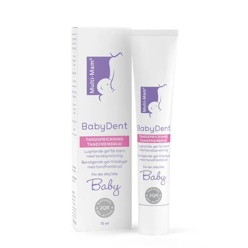 Multi-Mam Babydent er en beroligende gel til tandfrembrud hos babyer. Når tænderne begynder at vokse og bryde igennem tandkødet, kan det forårsage ubehag for babyen. Babydent beroliger og reducerer irritation. Produktet er baseret på patenteret 2QR-kompleks, som fremmer den naturlige bakterieflora. Behagelig smag. Sukkerfri.