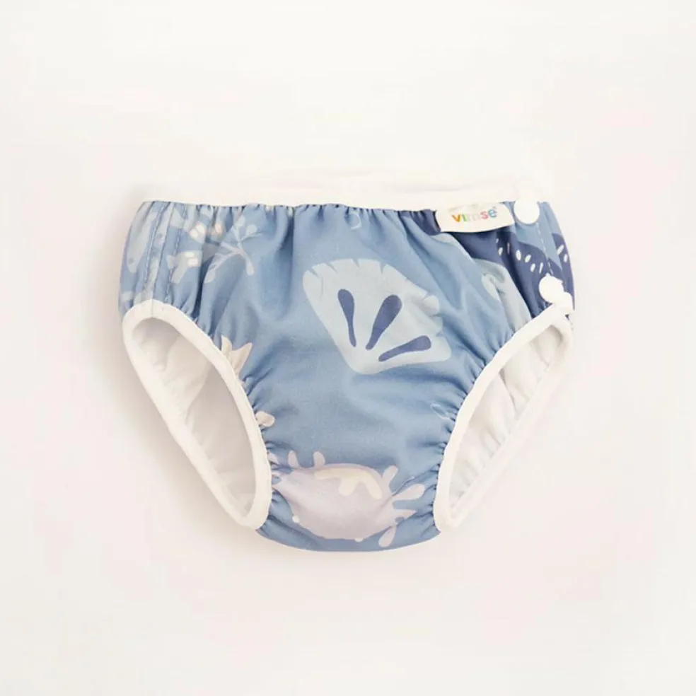 Fin blå badeble med motiv af havdyr. Takket være den bløde og smidige elastik i livet og ved benene, kan barnet bevæge sig frit rundt i vandet. Svømmebleen består af et lag blødt, lækagesikkert stof i tilfælde af uheld og flexibelt badetøjsstof på ydersiden.