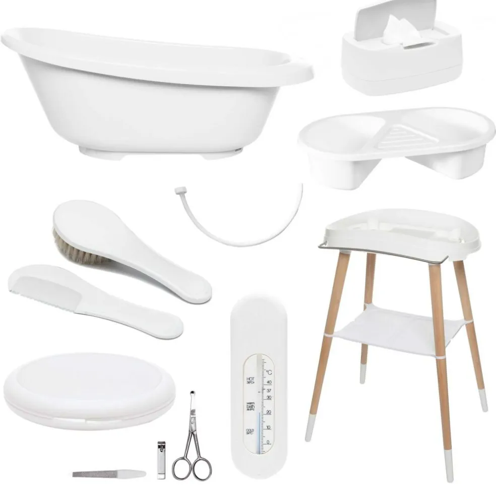 Alt i et stilrent, hvidt design – nemt at matche med øvrigt udstyr. Ideel som starter-sæt til nybagte forældre. Pakket i samlet enhed, klar til gave.