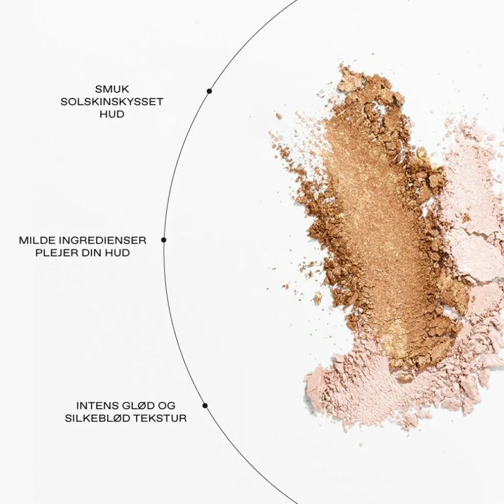 Golden er ideel til at forme ansigtet og lave naturlige skygger, og giver samtidig en smuk, solskinskysset hud – som et strejf af sommer midt i vinteren. De super fine, lysende pigmenter indrammer og markerer ansigtet, eller hvor du ønsker at tilføje en smule flatterende glød og udstråling. Den lette, transparente mineralformel er ren forkælelse for huden og en leg at arbejde med – som en magisk blush og toner i én!