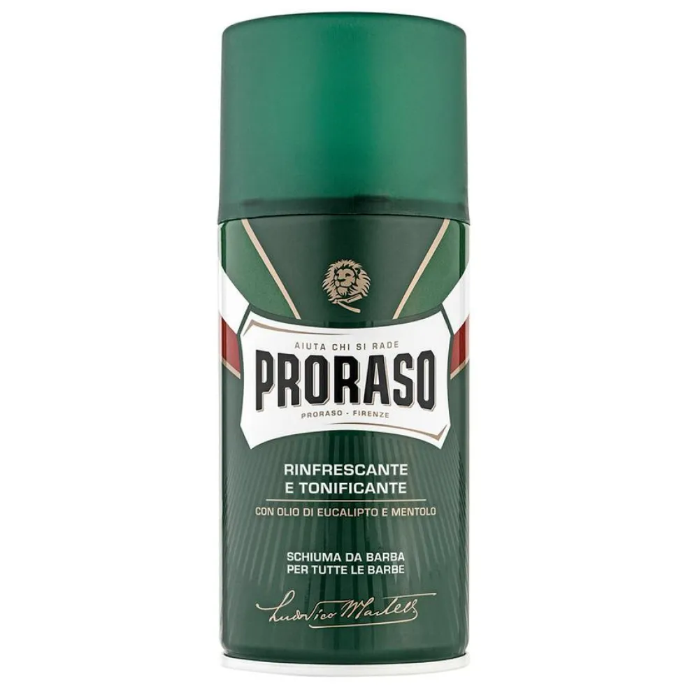 En frisk og tonende barberskum med eucalyptusolie og menthol. Blødgør skægget og giver dig en super tæt barbering. Til alle hudtyper. Sådan gør du: (punktet for det pågældende produkt er fremhævet) 1) Vask ansigtet grundigt. 2) Påfør Proraso barberskum. 3) Barber dig 4) Skyl ansigtet med koldt vand for at lukke porerne. 5) Brug din almindelige dags- eller ansigtscreme.