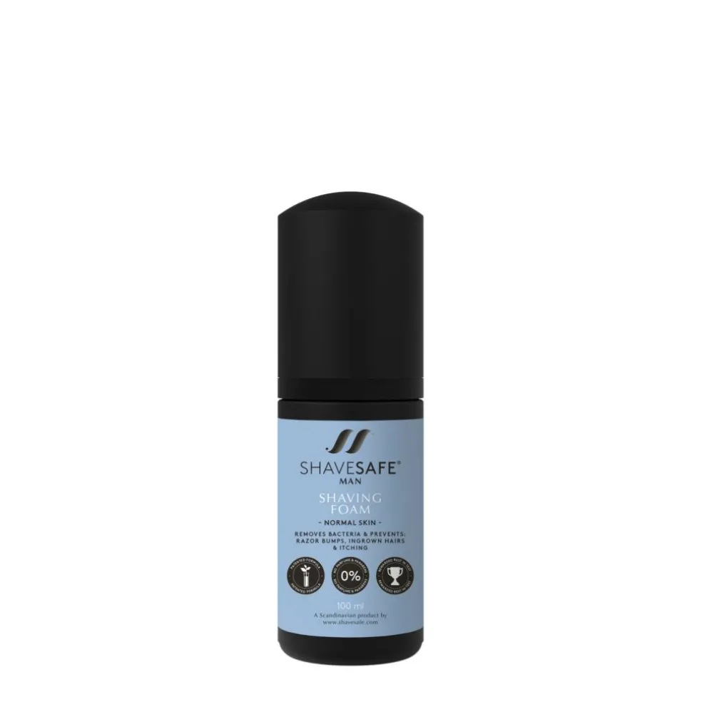 ShaveSafe Shaving Foam 100 ml Man fra ShaveSafe er en barberskum, som er udviklet specielt til mænd med sensitiv eller normal hud. Produktet er velegnet til ansigt, hals, nakke, bryst og krop – også intimt, og reducerer effektivt skægpest, rødme, barberknopper og indgroede hår.