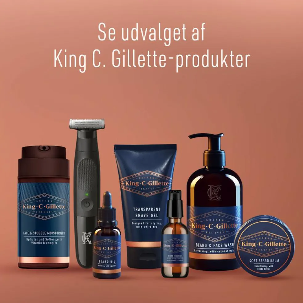 King C. Gillette skægserum er tilført vitamin B3 (niacinamid), pro-vitamin B5 (panthenol), arganolie og koffein og smører, styrker og gør hvert hårstrå tykkere for at beskytte mod knækkede hår og få skægget til at se tykkere ud King C.