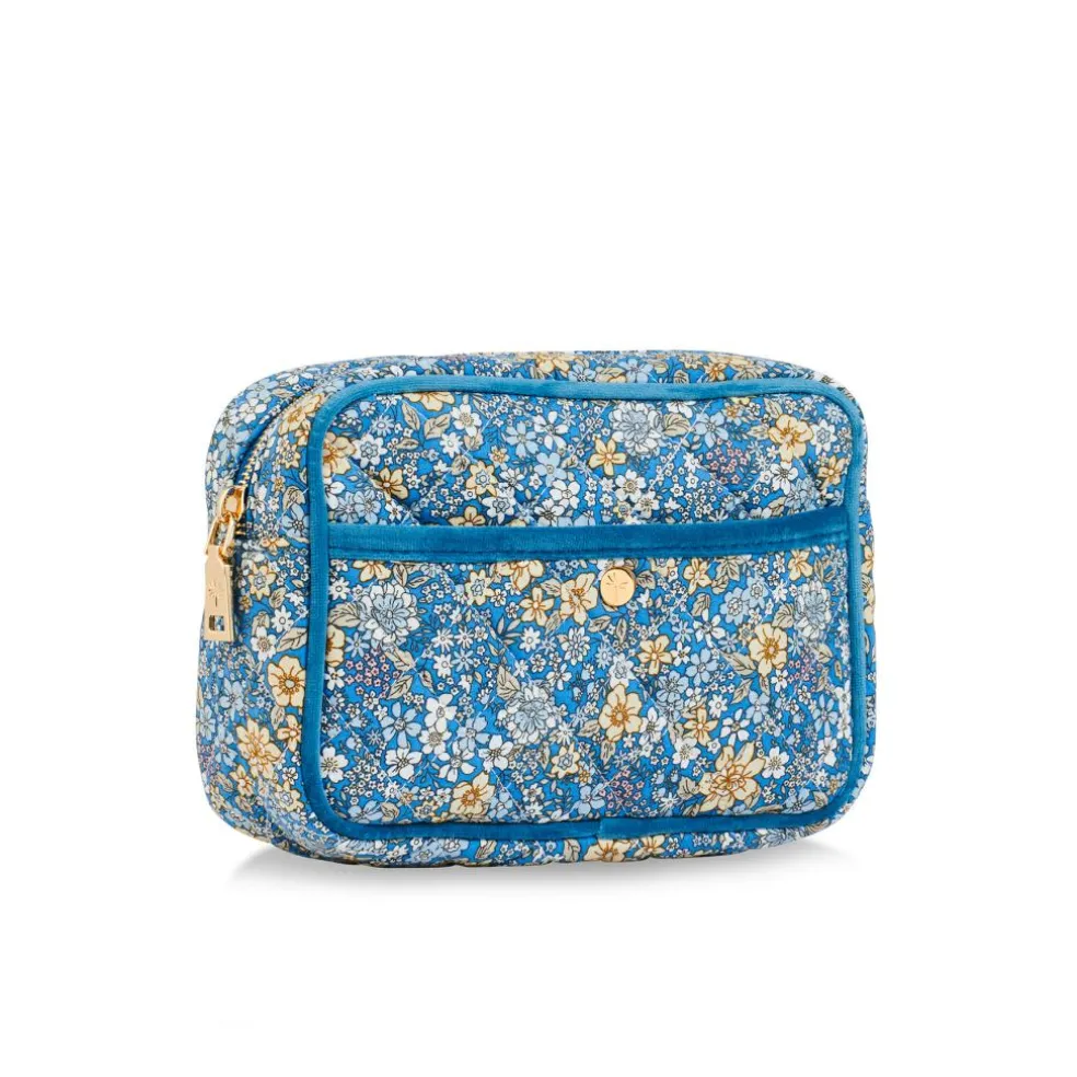 Blue Flower Toilettaske Medium. Toilettasken består af ét stort rum, som åbnes med lynlås og en ekstra lomme fortil, som åbnes og lukkes med en trykknap. Mål: 15 x 22 x 5 cm. Materiale: 100% Polyester, for: polyester og bomuld