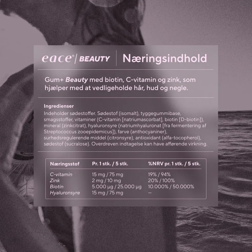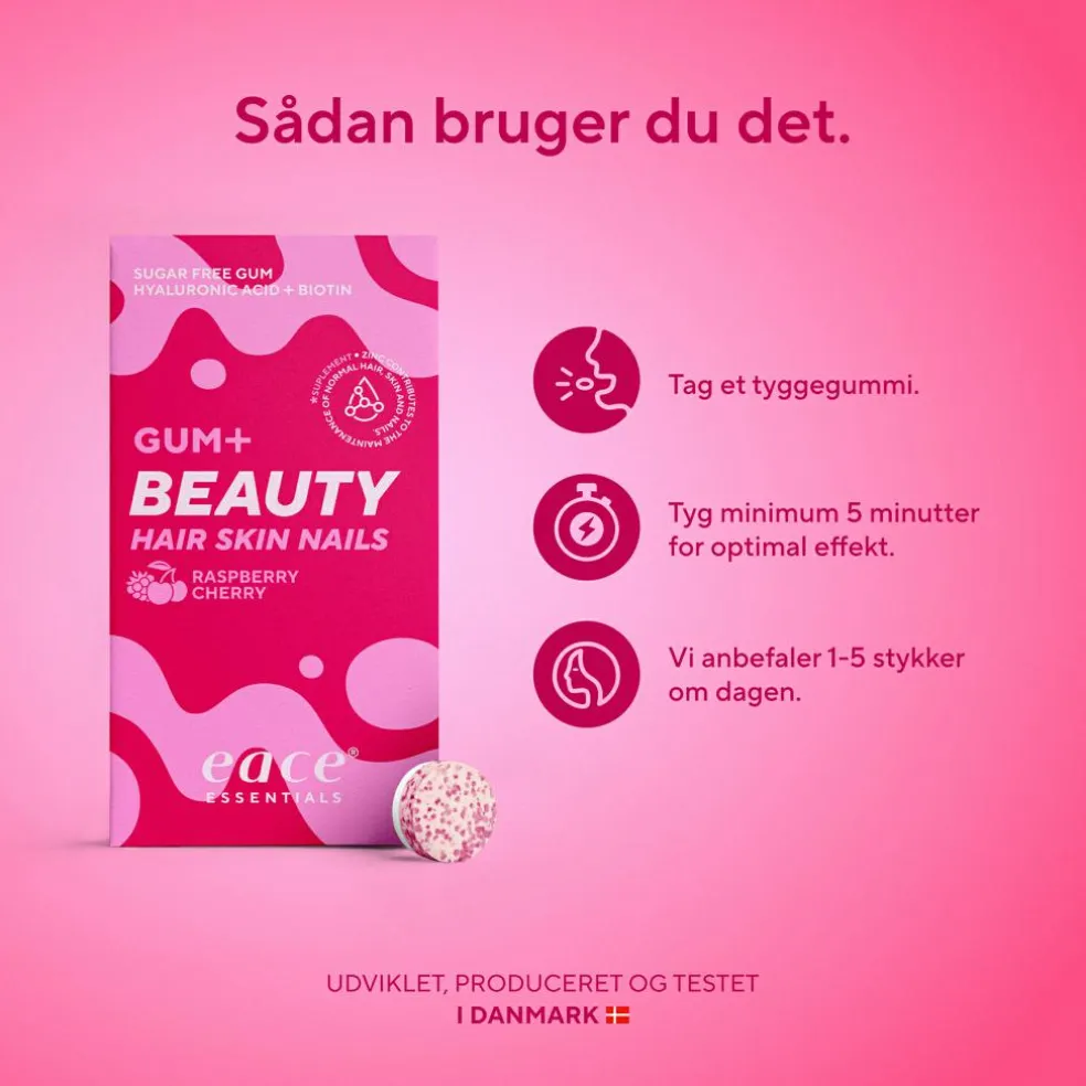 Med en skøn smag af hindbær og et diskret strejf af kirsebær gør Eace Gum + Beauty det nemt og lækkert at kombinere selvpleje med din daglige rutine. Forkæl dig selv – og lad Eace Gum + Beauty hjælpe dig med at pleje din skønhed indefra!