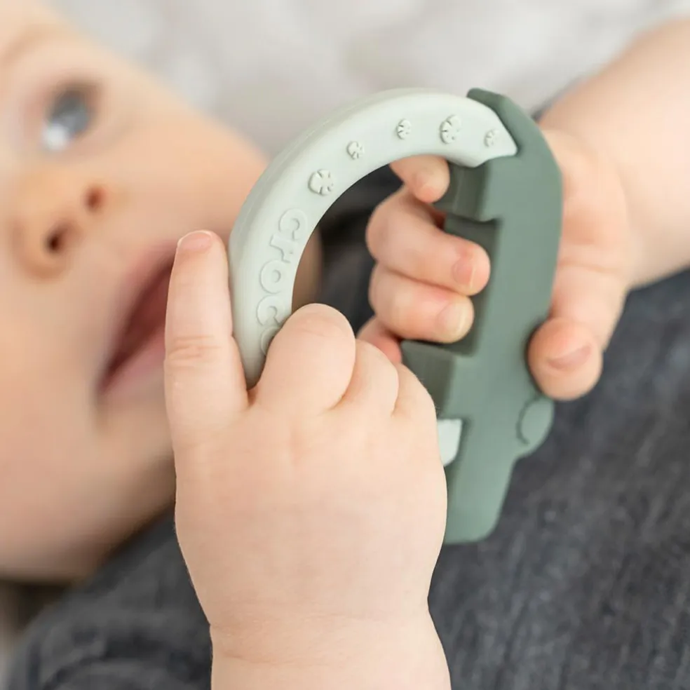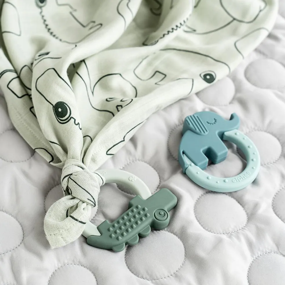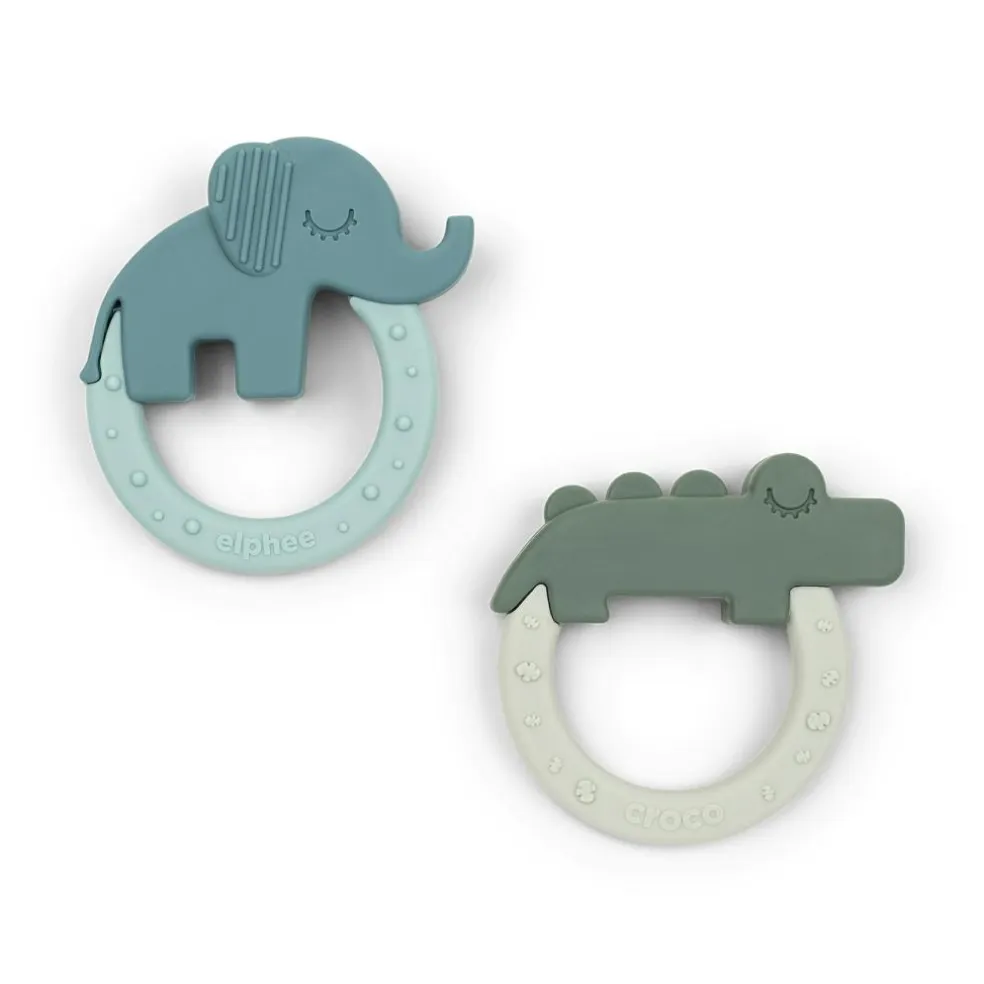 Sættet med de to bideringe er designet til selv de allermindste hænder og stimulerer både de visuelle, orale og taktile sanser hos baby. Den søde blå elefant og grønne krokodille er perfekt som et sanse-legetøj til din baby.