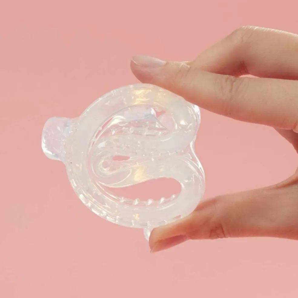 Den er i en nem-at-holde form og i blød silikone, der lige er smalt nok til at passe i munden på barnet.