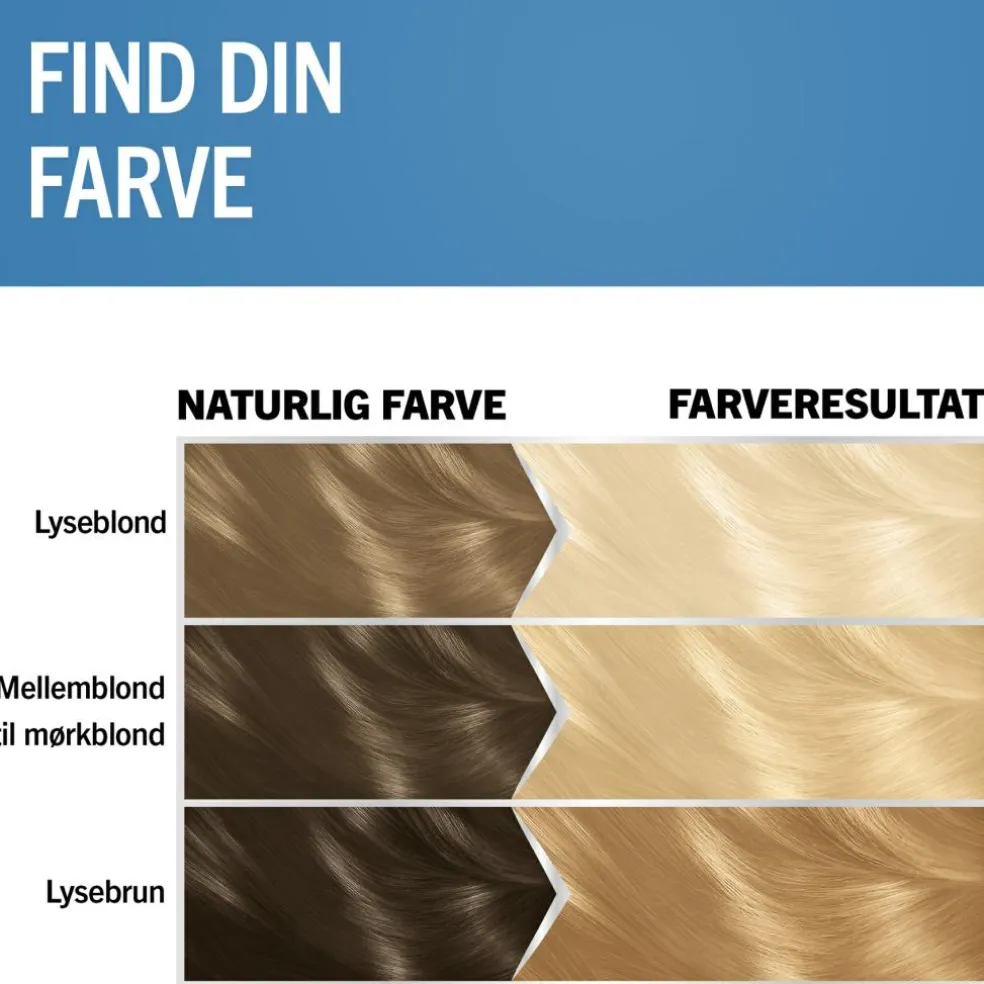 Tip: Hårafblegningen fungerer til alle hårtyper og er velegnet til nuancer fra lyseblond til lysebrun. Hvis du har skulderlangt, krøllet eller tykt hår, anbefaler vi, at du bruger to pakker.