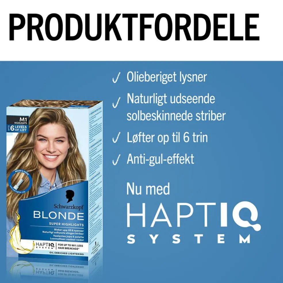 Ønsker du også at få smukke blonde striber samtidig med at beskytte dit hår? Hårfarvningen indeholder et HaptIQ-system, udviklet ud fra molekylær hårforskning, som reducerer hårets slid med op til 90%*. Det skaber nye mikrobindinger i håret og omslutter det med et beskyttende lag efter farvning.