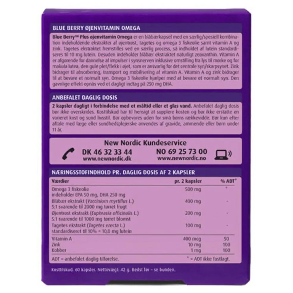 Blue Berry™ Plus Øjenvitamin Omega er en blåbærkapsel med en kombination indeholdende ekstrakter af øjentrøst, tagetes og omega 3 fiskeolie, samt vitamin A og zink.