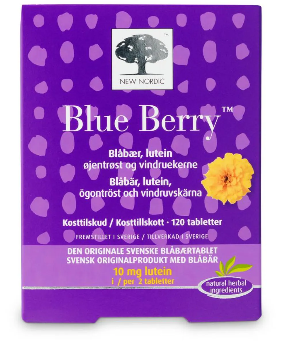 Disse originale svenske Blue Berry™ tabletter indeholder blåbær, tagetes standardiseret til at indeholde 10 mg lutein, øjentrøst og vindruekerne. Lutein er en naturlig carotenoid.