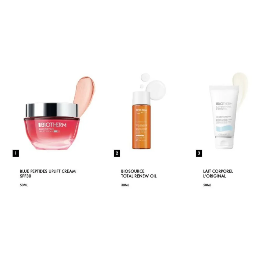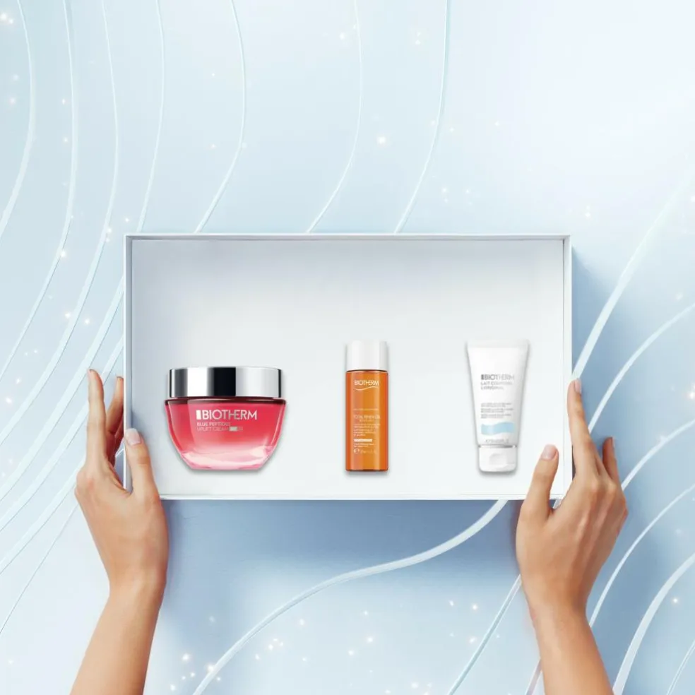Med Blue Peptides Uplift SPF30 Holiday Set får du en komplet hudplejerutine. Undgå området omkring øjnene. Rens først med Total Renew Oil Cleanser for at få en smuk og velplejet hud. Afslut med at fugte med Aquasource Hyalu Plump Gel. Sættet indeholder også en Lait Corporel Body Lotion, som du skal bruge på kroppen efter du har været i bad.