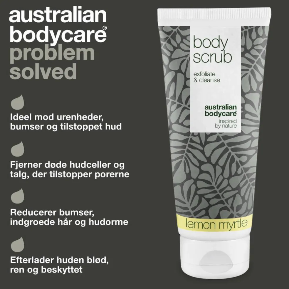 Dybderensende Body Scrub med Tea Tree Oil og Lemon Myrtle til eksfoliering af uren hud på kroppen, bumser på ryggen eller ballerne.