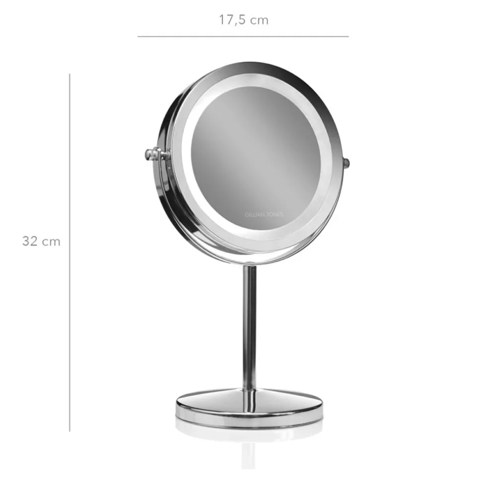 Gillian Jones Ståspejl er et elegant og praktisk spejl med LED-lys, der er perfekt til din daglige skønhedsrutine. Dette tosidet spejl kombinerer funktionalitet med et stilrent design, hvilket gør det til en uundværlig accessory på dit badeværelse eller makeupbord.