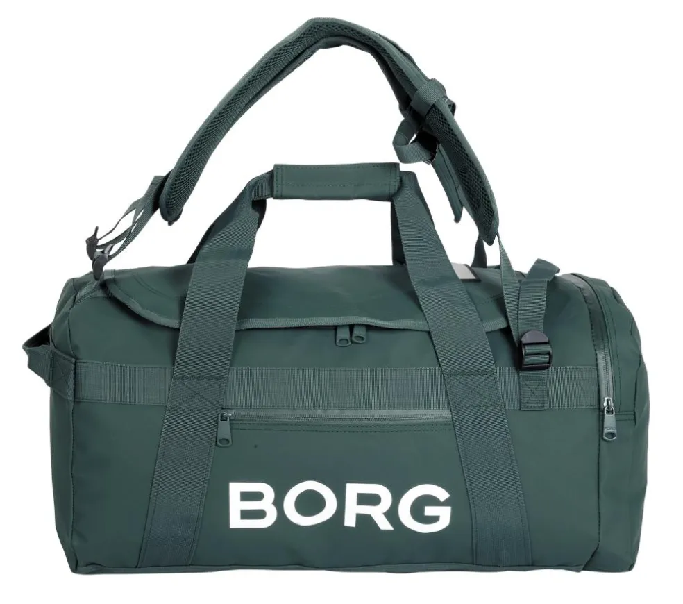 Fremstillet af det gummiagtige materiale TPE og rummer 55 liter. Indersiden af tasken har lommer i mesh, tilgængelig i to farver med det ikoniske Borg-print på siden.