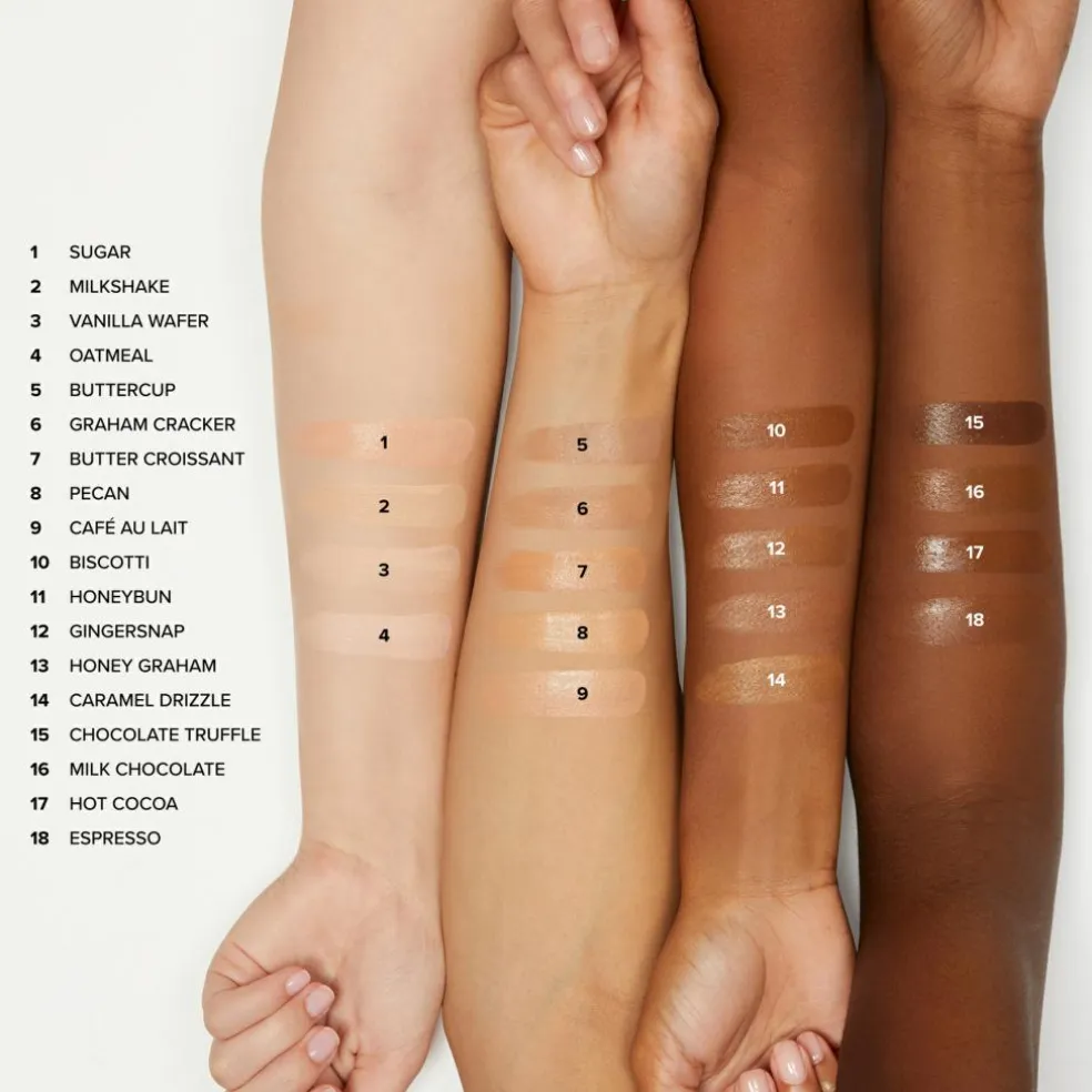Farvekorrigeres med en af følgende nuancer af Born This Way Super Coverage Concealer: Cream Puff (bleg til lys), Taffy (medium til tan) eller Chai (tan til mørk).