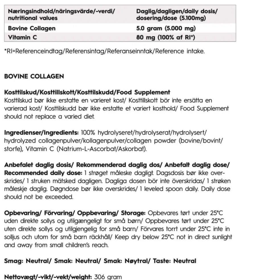 •100% hydrolyseret bovinekollagenpulver med en Da på kun 2000, som sikrer optimal optagelse