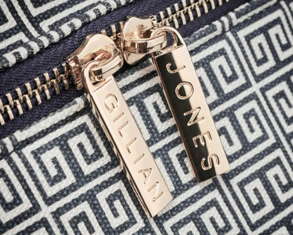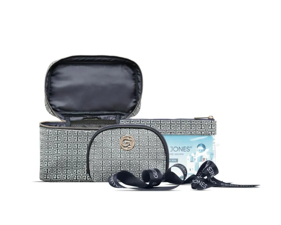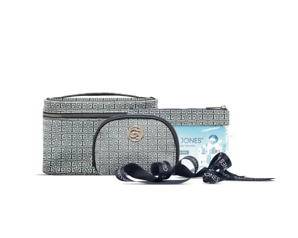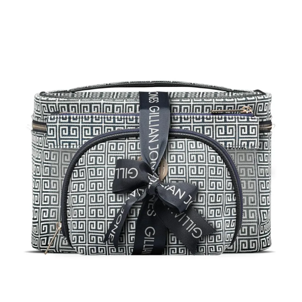 Makeup pungen har en stor åbning som giver et godt overblik over indholdet. Inden i er makeuppungen indrettet med en stor lynlåslomme. En fin Gillian Jones printet sløjfe gør dette 3-dele sæt til den perfekte gave.