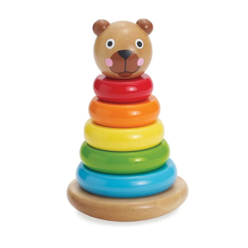 Dette farverige træ-stablespil inkluderer magnetiske ringe,
