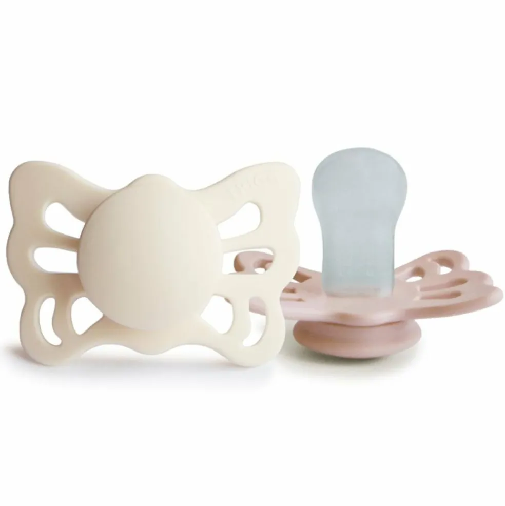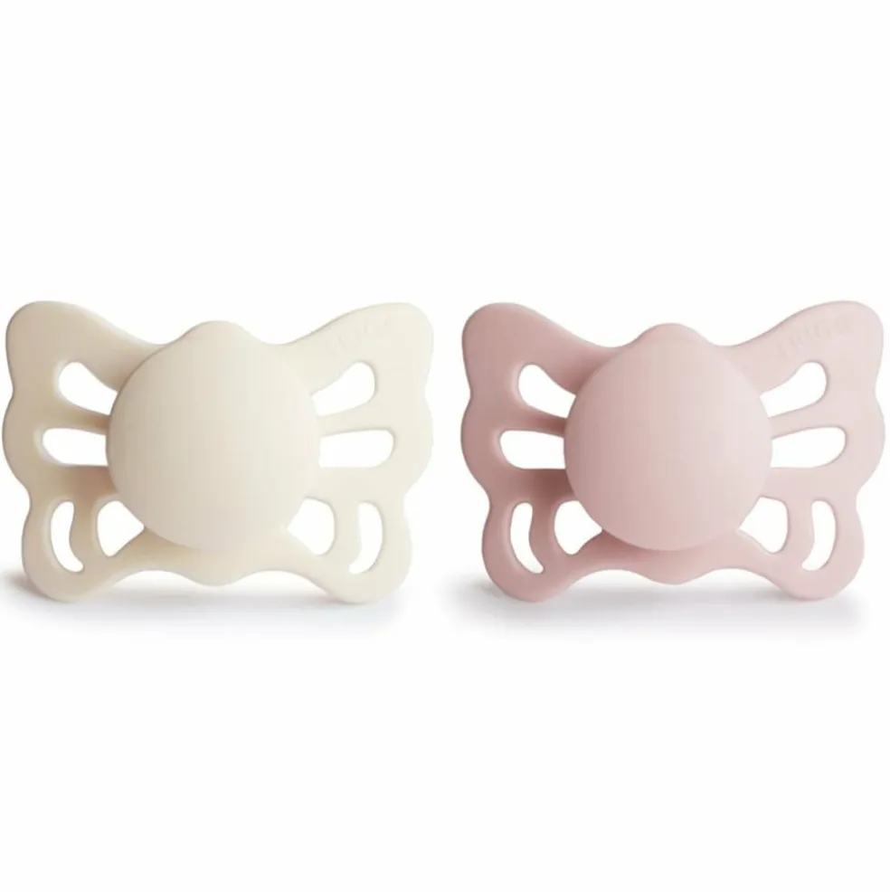 FRIGG Butterfly er en anatomisk sut, der er skabt med en suttedel, der matcher formen på barnets mund. Designet er omhyggeligt udformet for at mindske trykket på ganen, gummerne og kæberne, hvilket gør det til den blideste type sut.