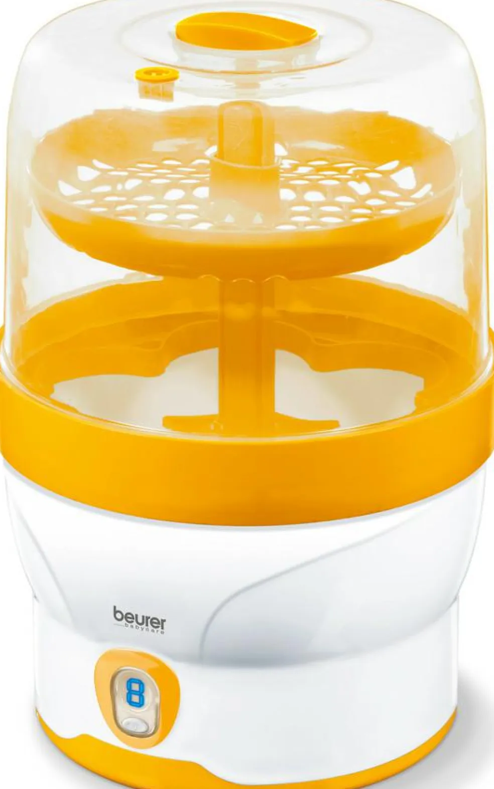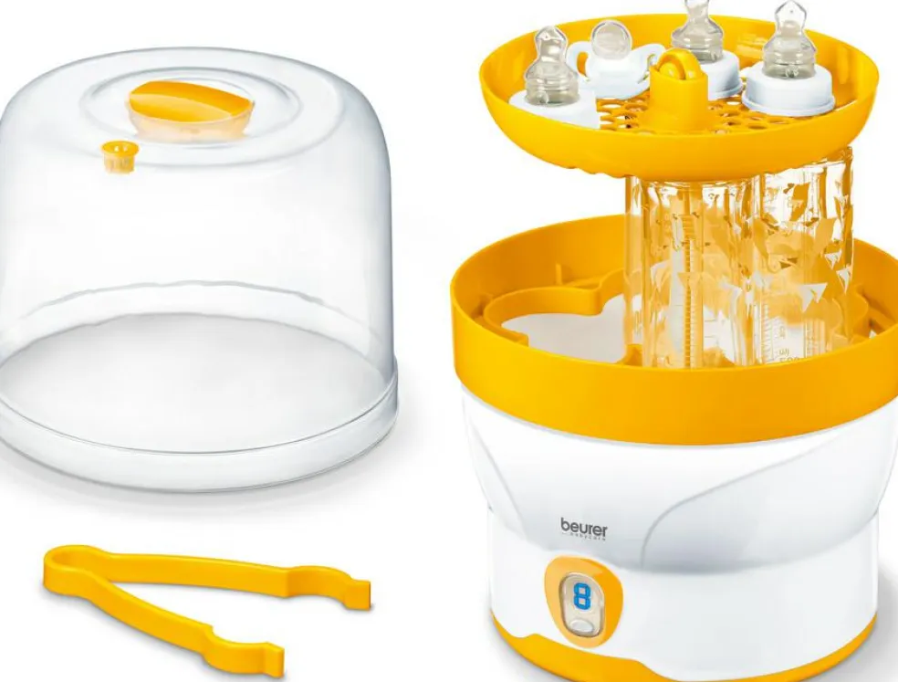 Helt uden kemiske tilsætningsstoffer elimineres skadelige bakterier til gavn for dit barns sundhed. Dampsterilisatoren fra Beurer kan sterilisere op til 6 sutteflasker + tilbehør på bare 7 minutter! Indholdet kan holdes sterilt i hele til 3 timer efter, hvis låget forbliver uåbnet.
