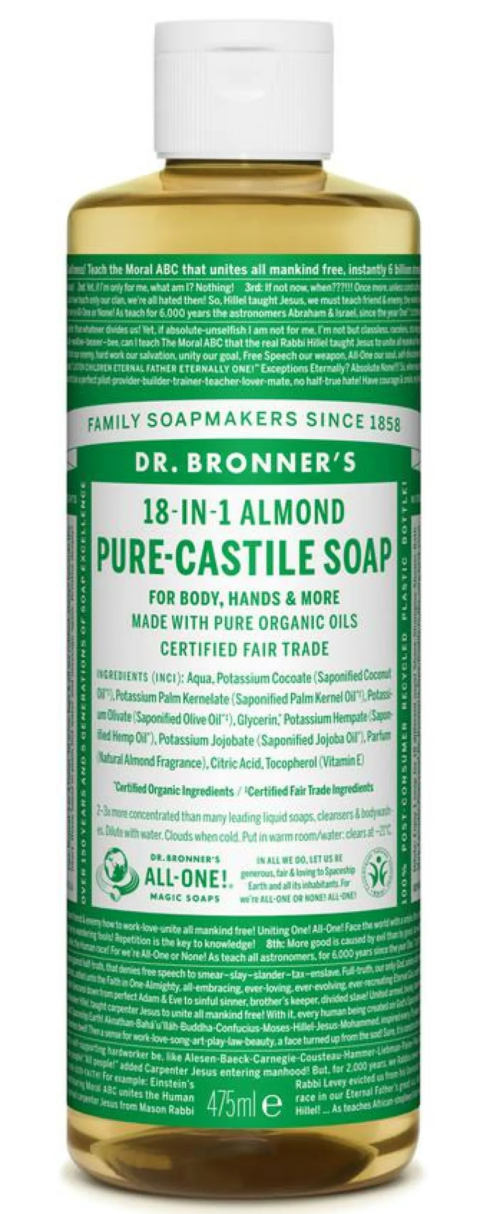 Vores 18-i-1 naturlige sæbe er pakket i en 100 % genbrugsflaske.